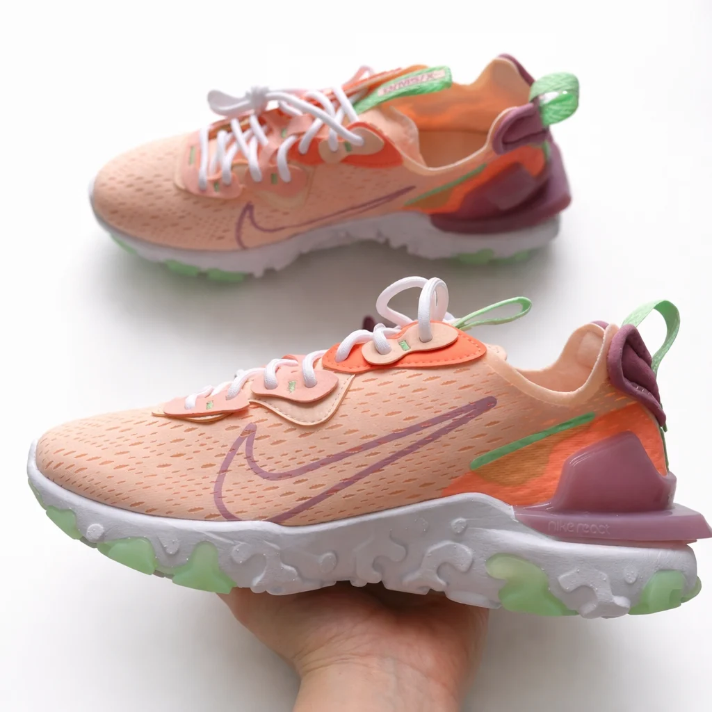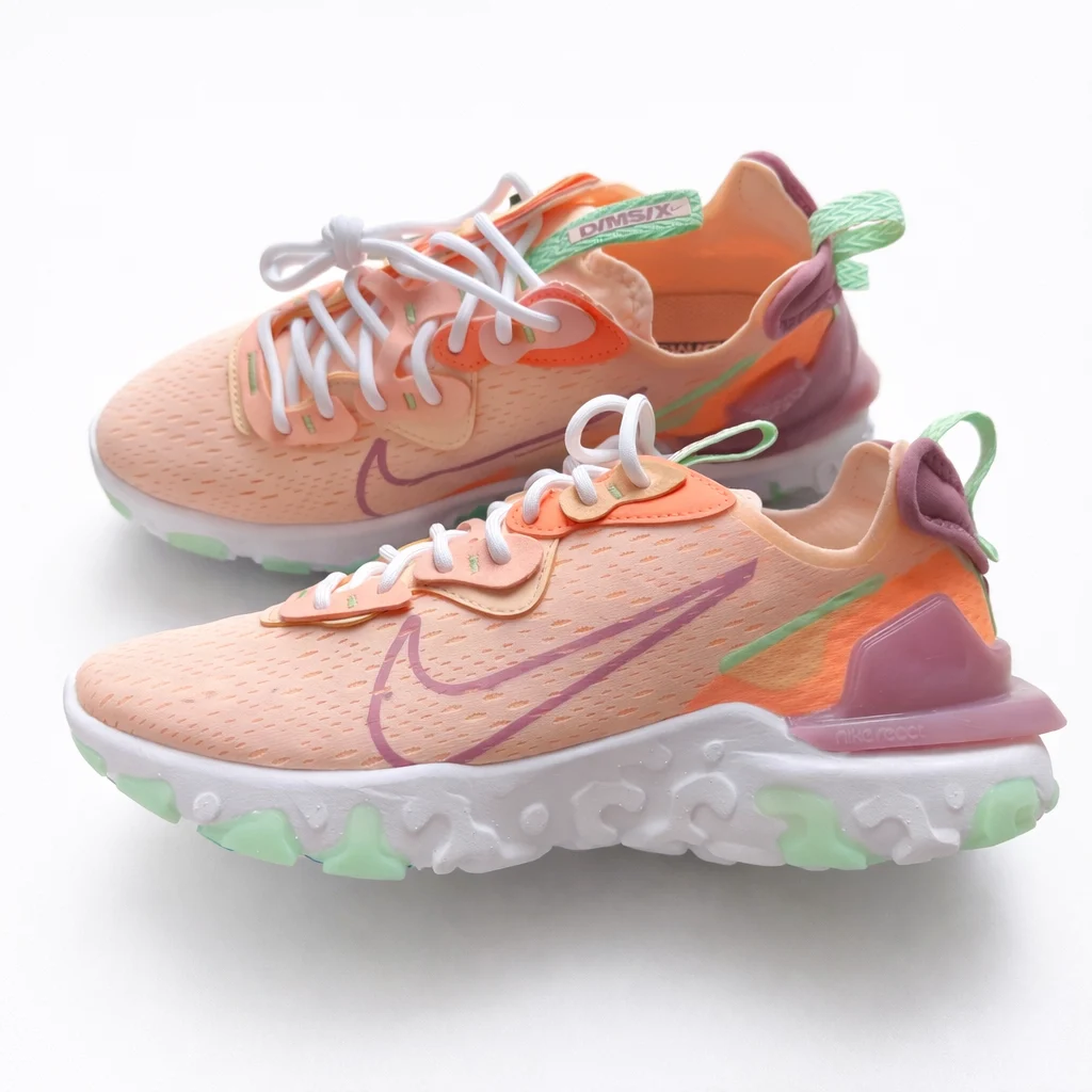 Divatos Nike React Vision sportcipő barack árnyalatban, modern és különleges dizájnnal. A könnyű, légáteresztő felsőrész és a Nike React hab talp kiváló párnázást biztosít, így egész nap kényelmes viseletet nyújt. Sportos és trendi választás a mindennapi outfitekhez. 👟