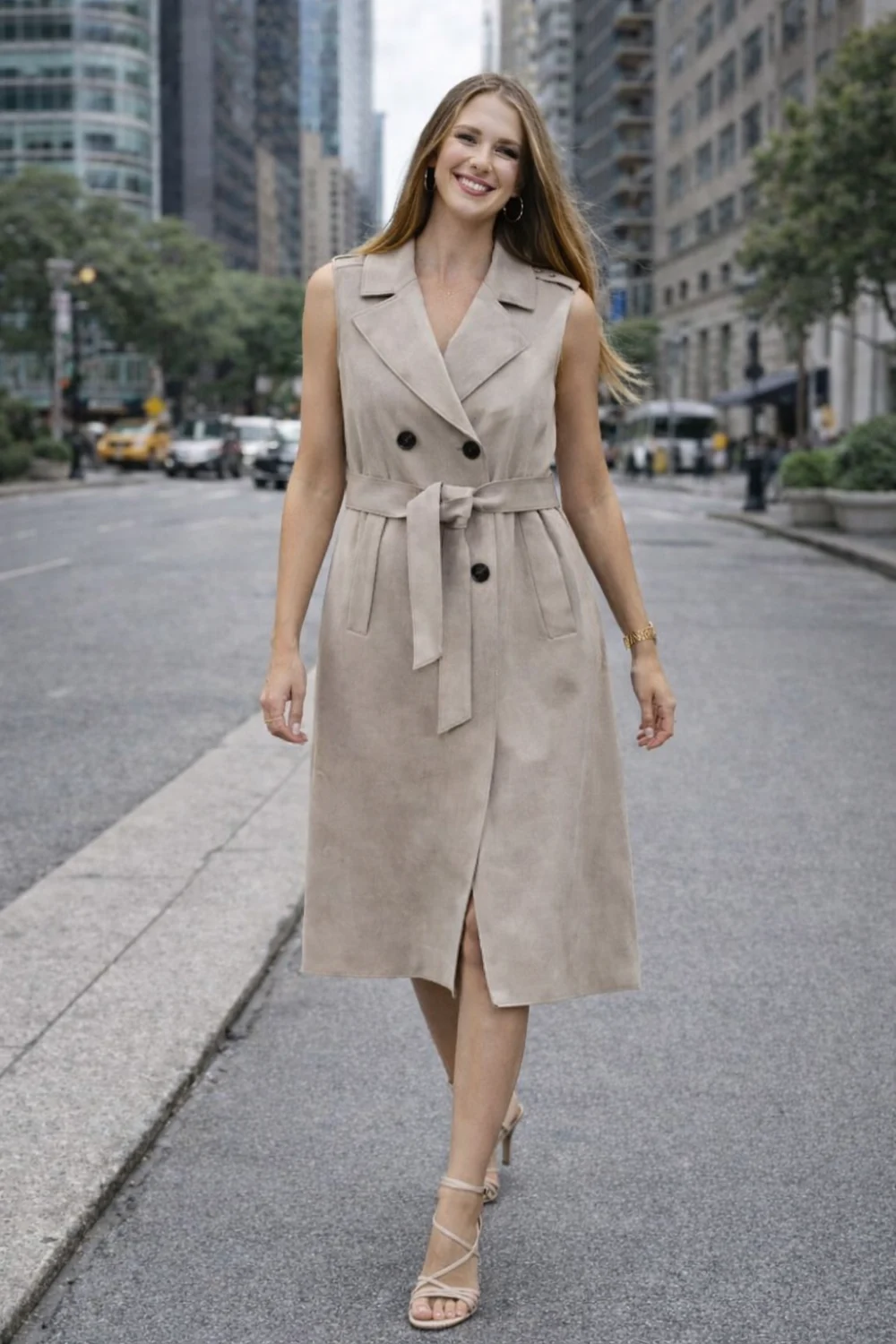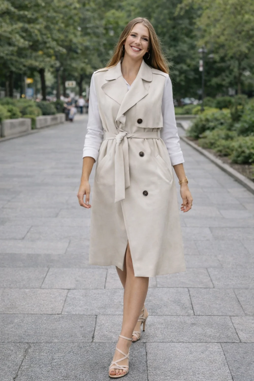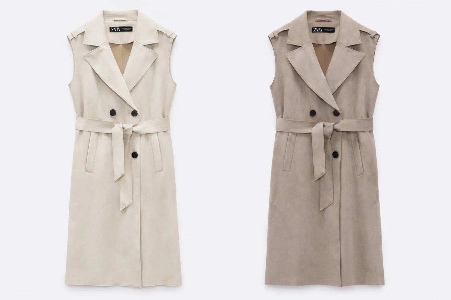 A mellényként vagy hosszú ruhaként viselhető fazonhoz járó kötő hangsúlyozza a derékvonalat – tökéletes választás casual vagy elegáns szettekhez egyaránt.