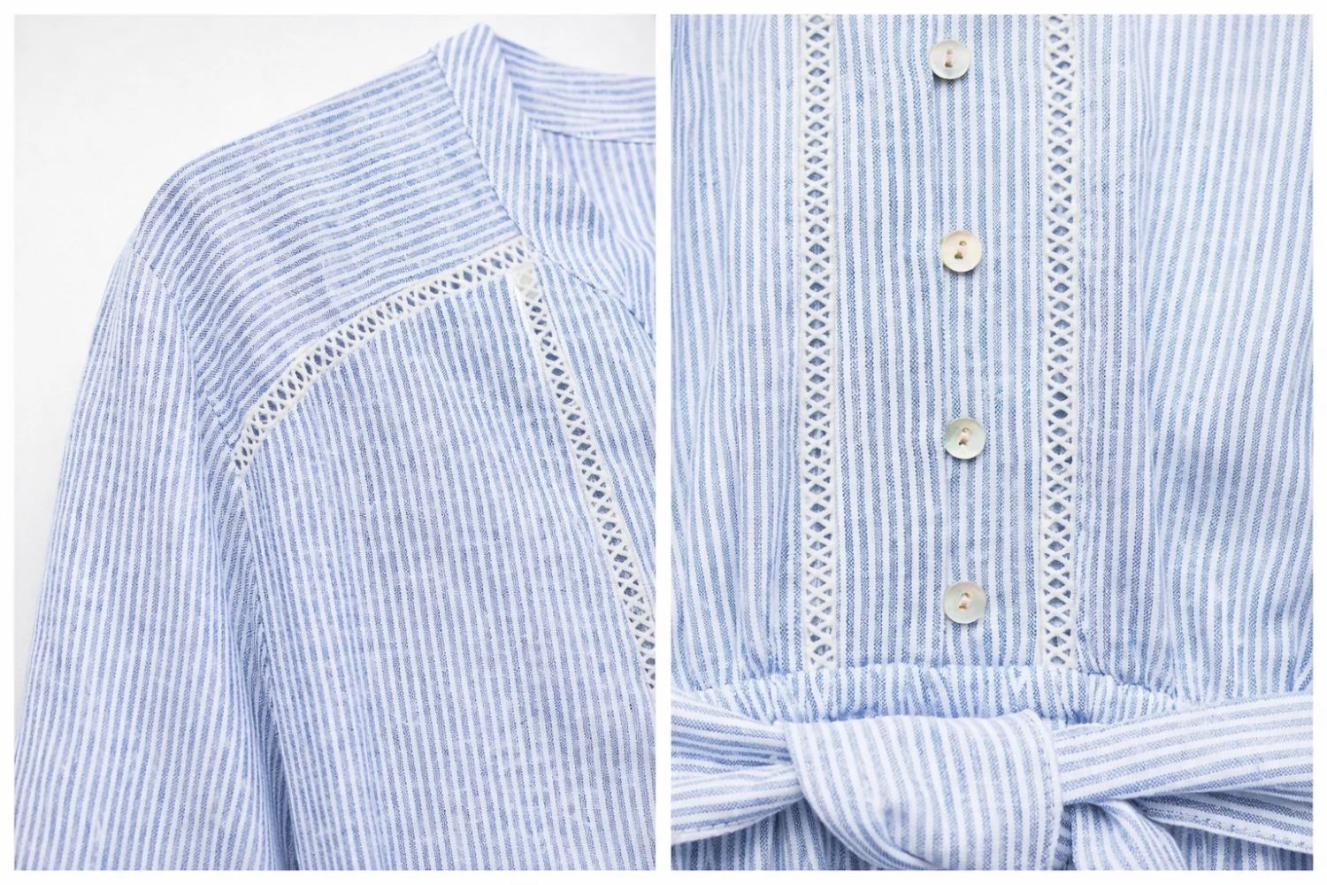 Friss és nőies darab a Zara kollekciójából: ez a fehér/kék csíkos, lenvászon tartalmú nyári ruha csipkebetéteivel és fodros kialakításával könnyed, elegáns megjelenést biztosít a meleg napokra.