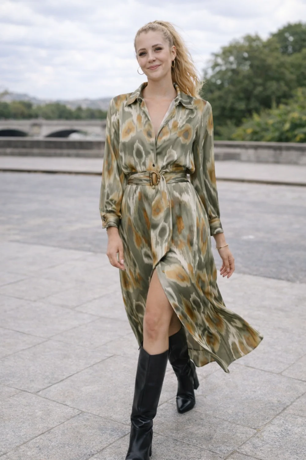 Elegáns és nőies darab különleges megjelenéshez. A szatén anyag finoman fényes, lágy esésű hatást ad, a khaki mintás design pedig friss, stílusos összhatást biztosít.