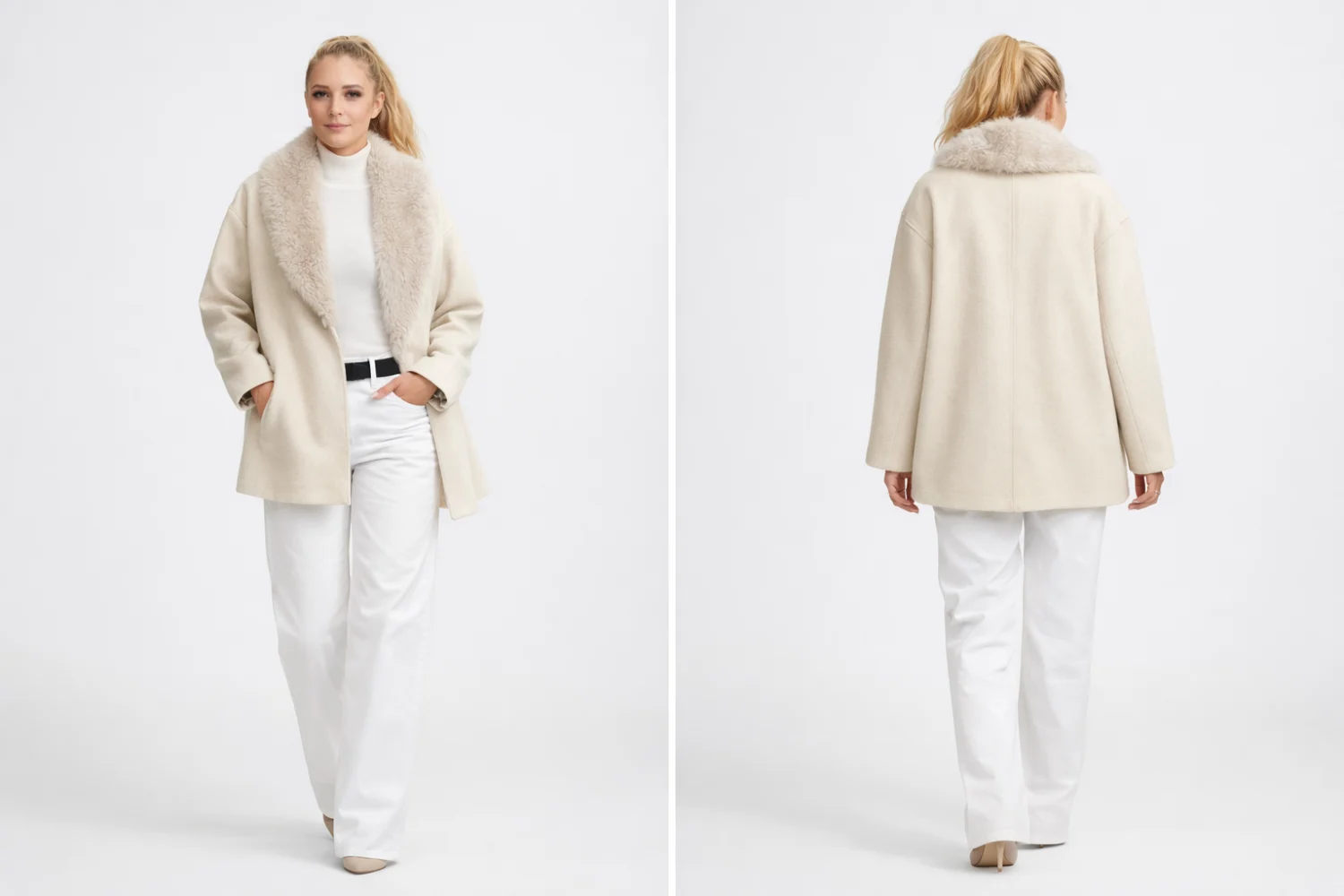 Stílusos Zara oversize női kabát, amely puha, meleg anyagból készült. A szőrmehatású gallér elegáns megjelenést ad, amely levehető, így többféleképpen is viselhető. Kényelmes, trendi darab, tökéletes választás hűvösebb napokra és stílusos téli outfitekhez.