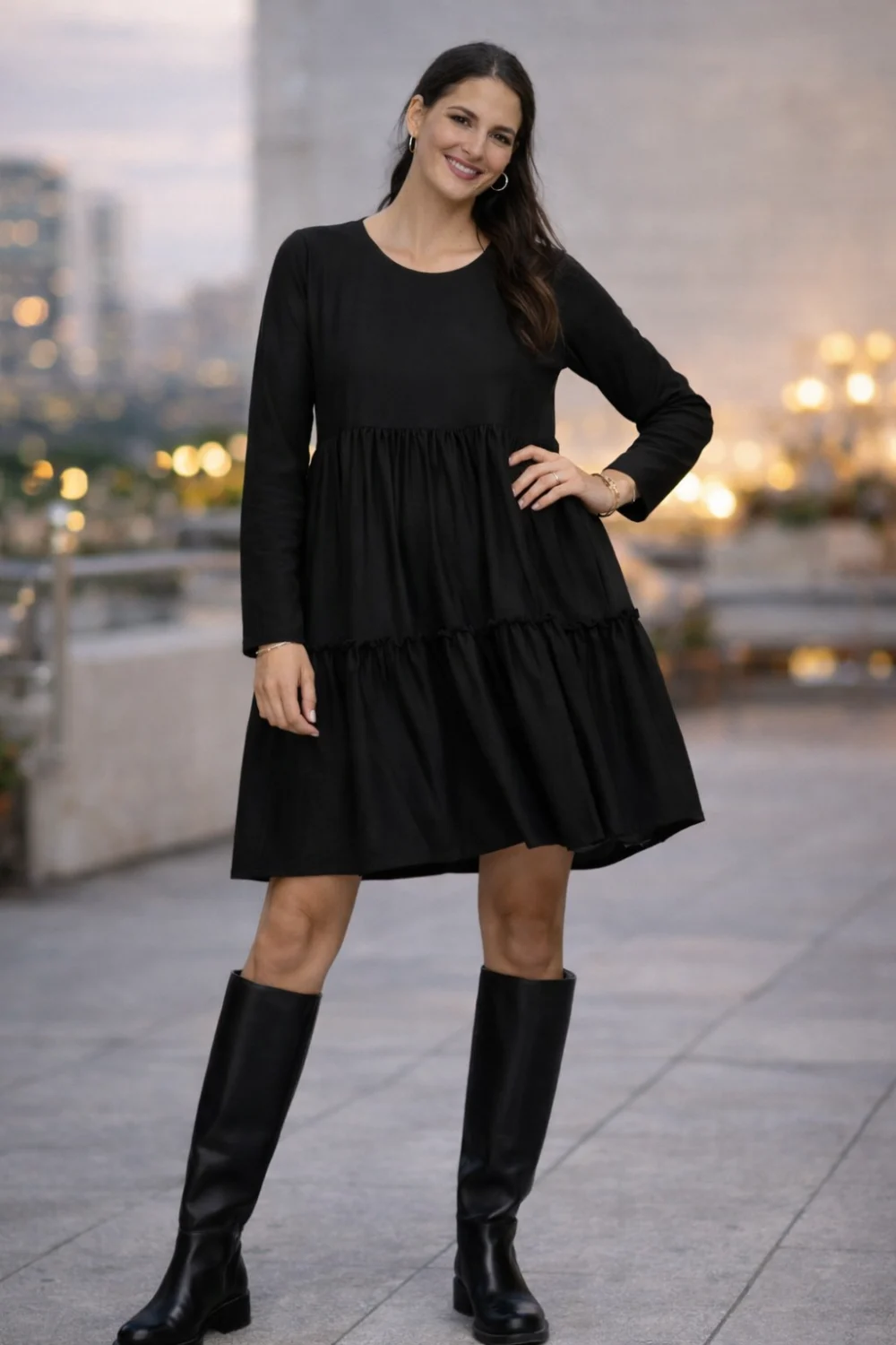 A fodros részletek játékos, romantikus hangulatot kölcsönöznek a ruhának, a klasszikus fekete szín pedig időtlen eleganciát sugall. Tökéletes választás alkalmakra, vacsorákra vagy akár egy csinosabb hétköznapi megjelenéshez is. Könnyen kombinálható magassarkúval vagy elegáns bokacsizmával.