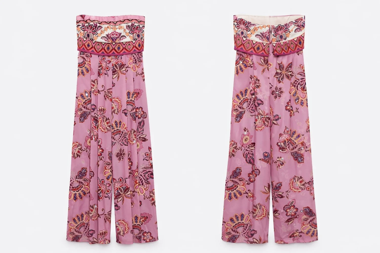 Zara rózsaszín mintás hosszú szatén fodros pánt nélküli overál