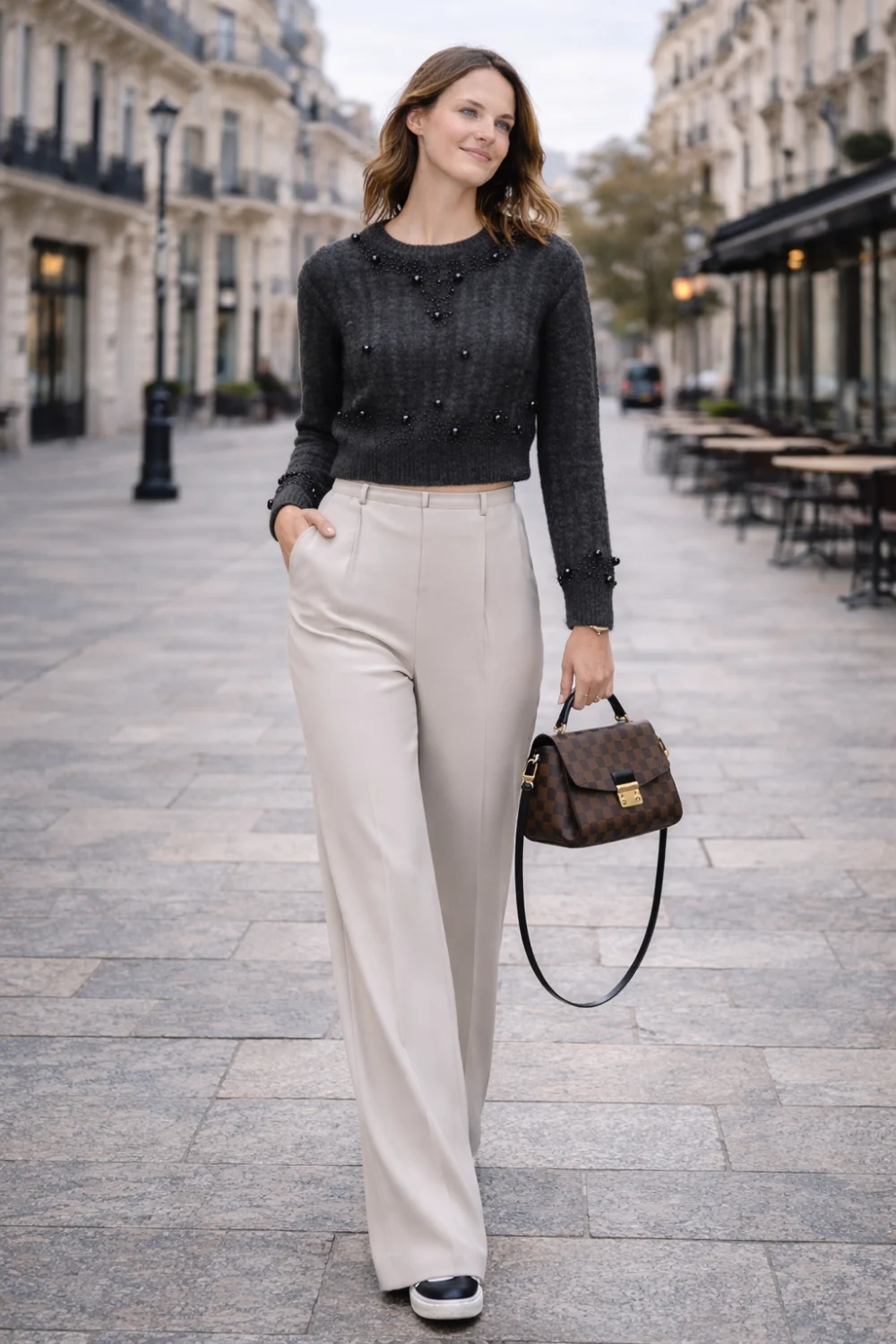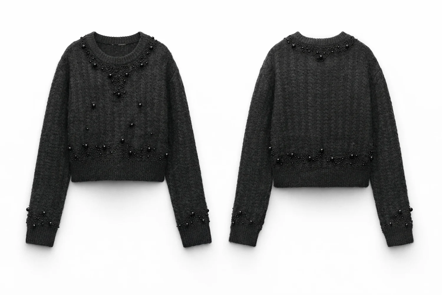 A gyöngyös díszítés elegáns, finom részletként emeli ki a ruhadarabot, miközben puha anyaga kényelmes viseletet nyújt. Könnyen kombinálható magas derekú nadrággal vagy szoknyával, így ideális választás hétköznapi vagy csinosabb outfitekhez.