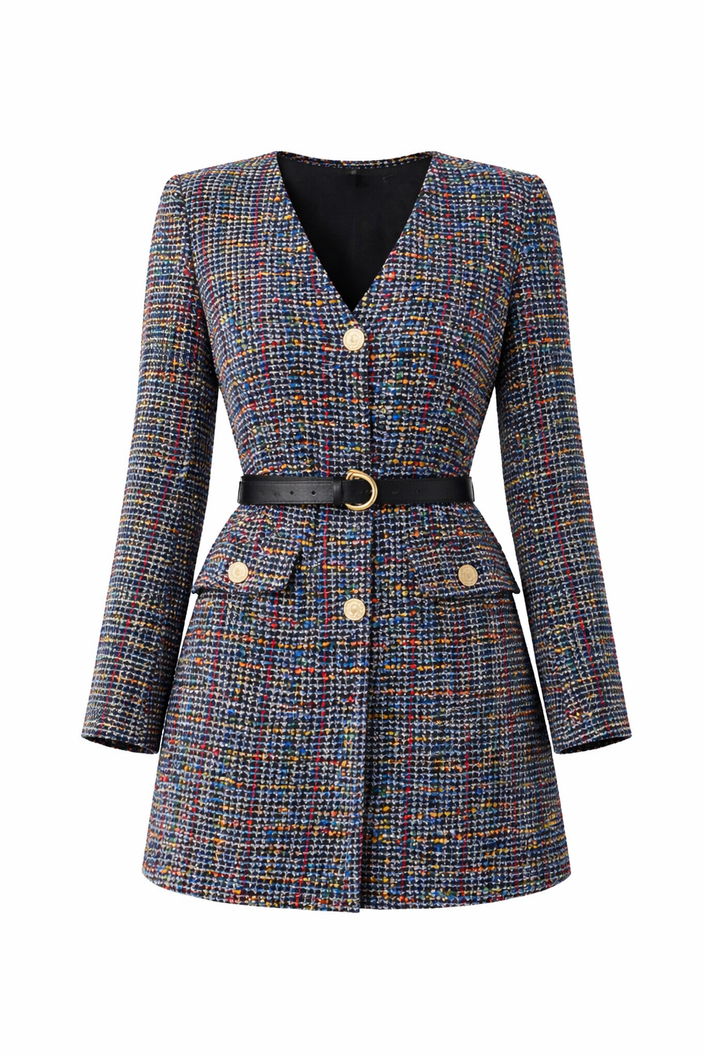 Az arany gombok elegáns, dekoratív részletként emelik ki a ruhát, az öv pedig nem a ruhához tartozik, így szabadon variálható a stílusos kiegészítéssel. Tökéletes választás alkalmi eseményekre, esti programokra vagy egy magabiztos, elegáns megjelenéshez.