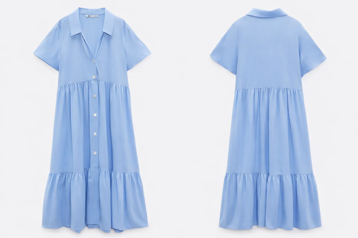 Könnyed és stílusos darab a Zara kollekciójából: ez a világoskék, lezser szabású hosszú ruha gombos kialakításával és rövid ujjával kényelmes, mégis nőies viselet a mindennapokra.