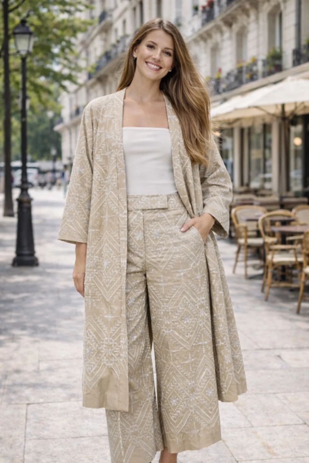 Elegáns Zara női nadrág bézs–fehér színben, finom hímzett részletekkel. Kényelmes, könnyű anyagból készült, amely stílusos és nőies megjelenést biztosít. Tökéletes választás nyári outfitekhez, alkalmi vagy elegáns hétköznapi viselethez.