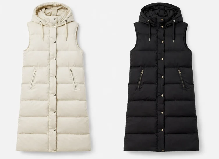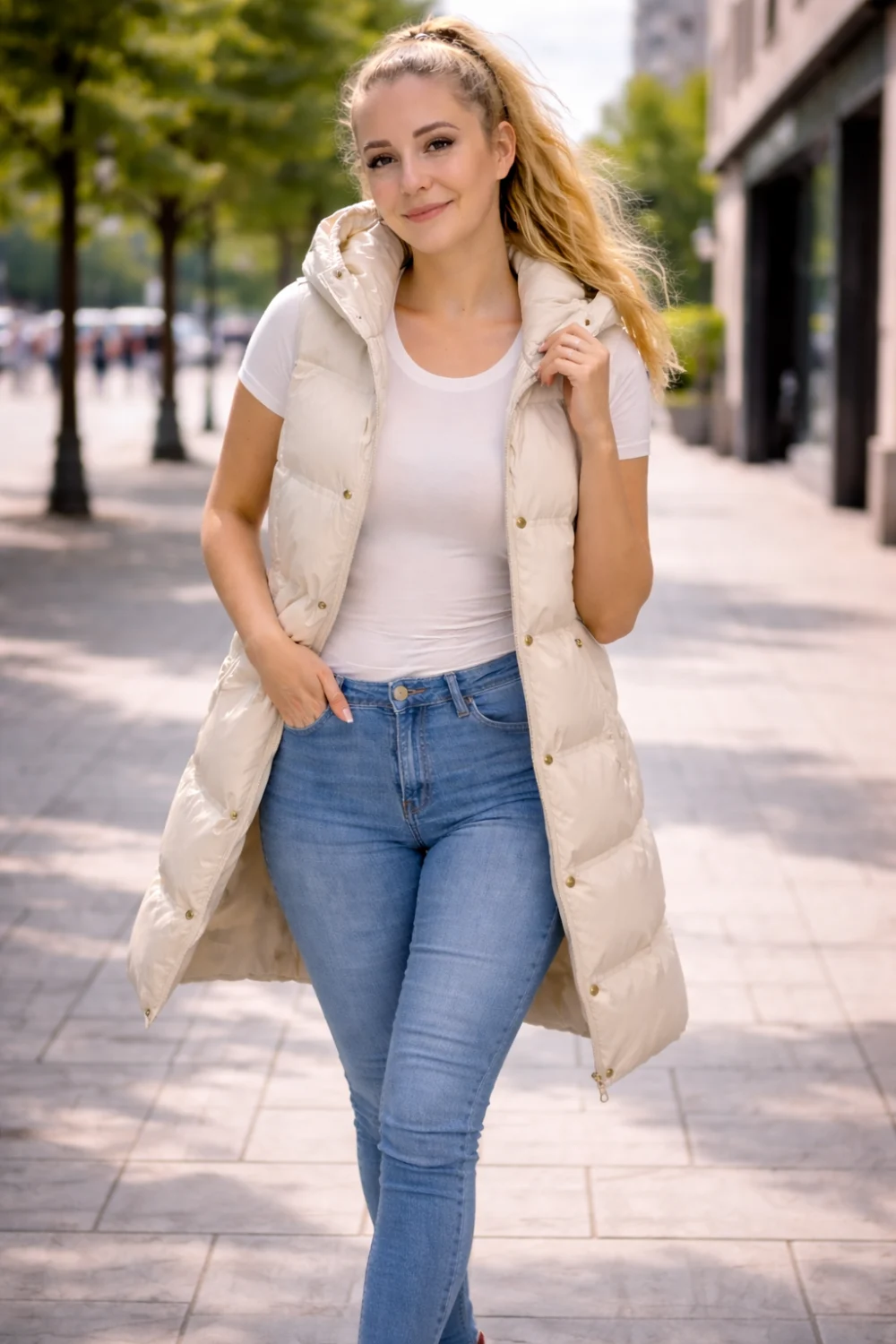 Praktikus és trendi darab, amely stílusos védelmet nyújt a hidegebb napokon. Ez a hosszított pufi mellény bézs és fekete színkombinációban készült, így könnyen variálható különböző outfitekkel.