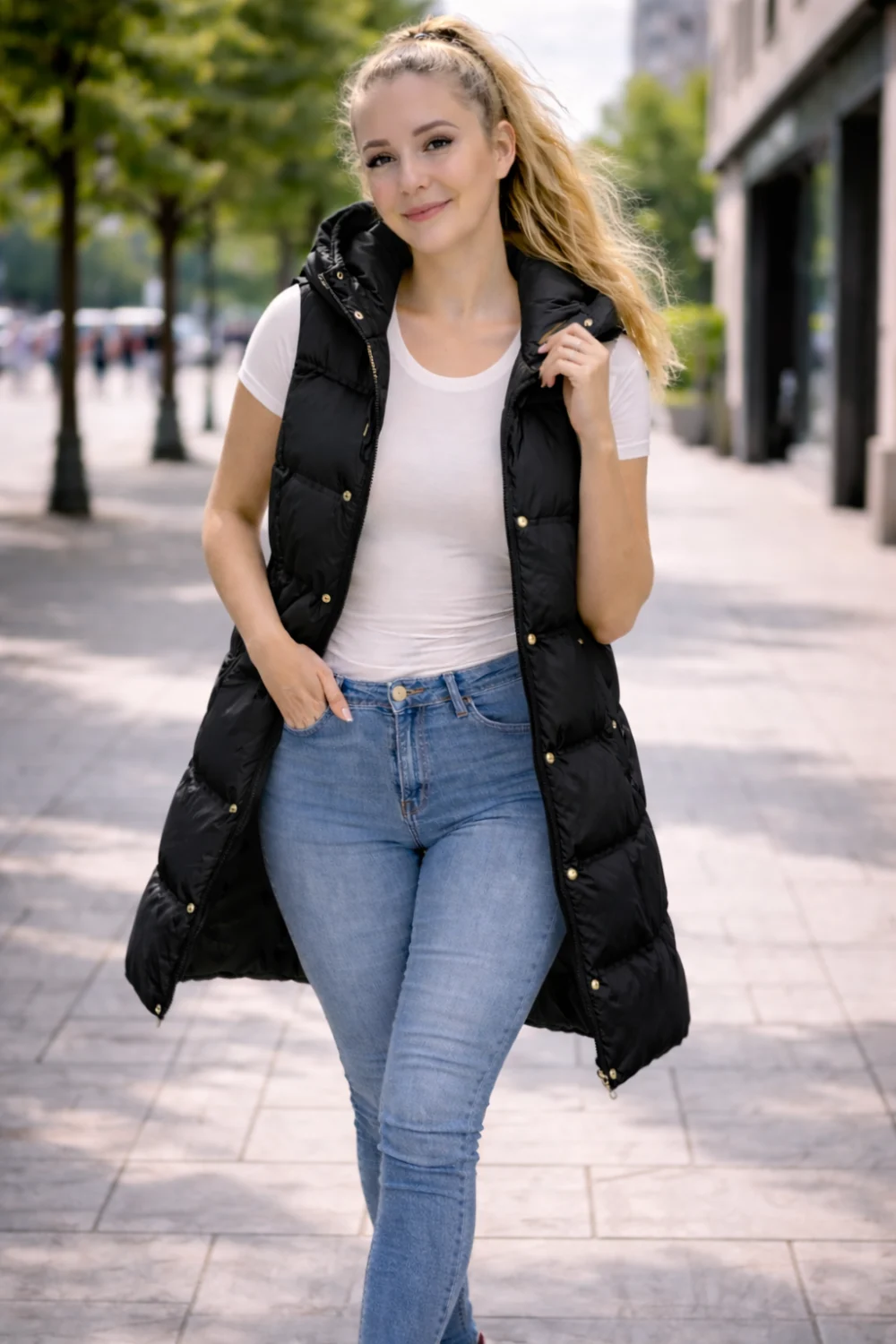 Zara bézs/fekete hosszított pufi mellény – cipzáras és gombos rögzítéssel