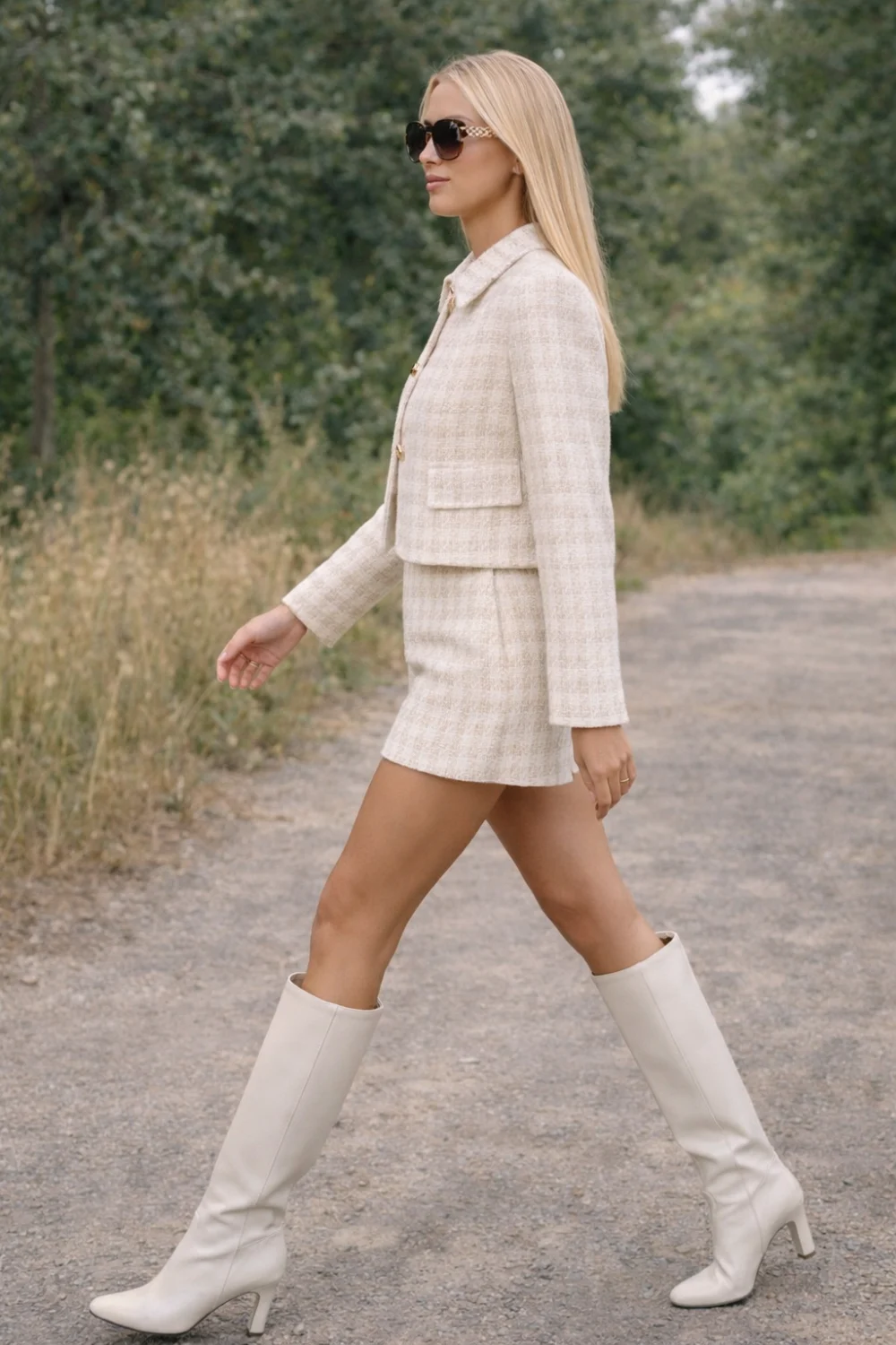 Klasszikus elegancia modern formában. A strukturált, texturált hatású anyag kifinomult megjelenést ad, míg a rövidnadrág friss, nőies könnyedséget visz az összhatásba. Az arany díszgombok elegáns részletként teszik teljessé a stílust, az oldalsó cipzár pedig diszkrét és praktikus megoldást biztosít.