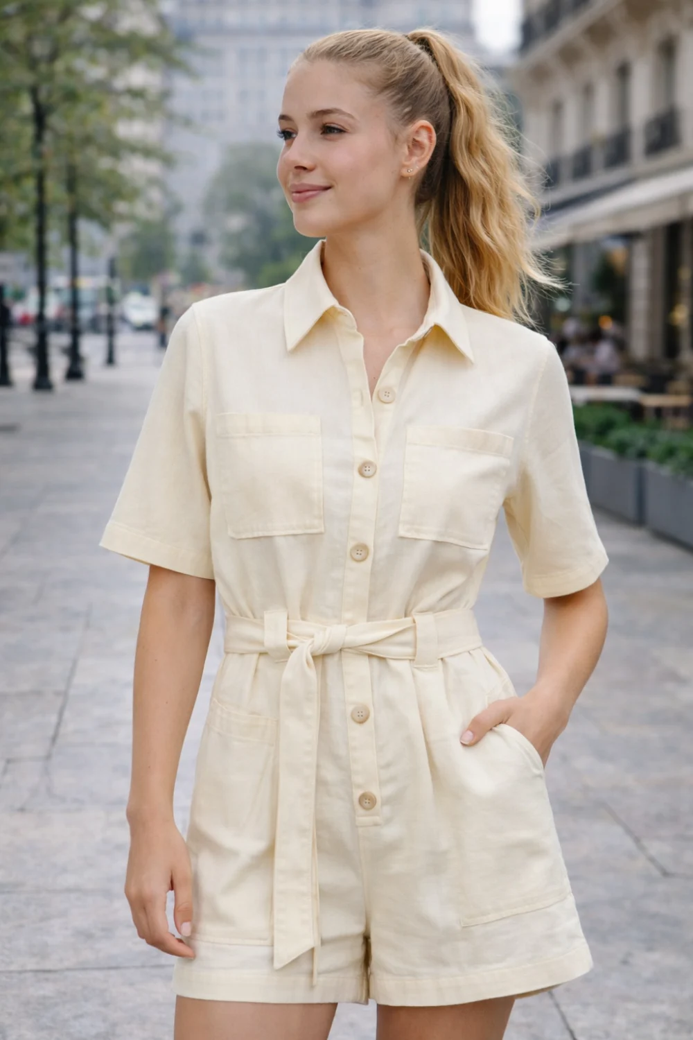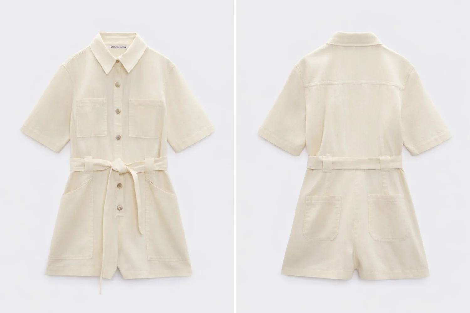 Csinos Zara női rövid overál bézs színben, könnyű, vékony farmer anyagból. Deréknál megkötővel készült, amely szépen kiemeli az alakot. Kényelmes és stílusos darab, tökéletes választás nyári outfitekhez és hétköznapi viselethez.