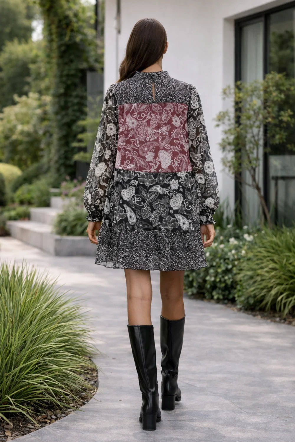 Kifinomult színvilág és nőies megjelenés egyben. A rövid fazon könnyed viseletet biztosít, míg a bordó-szürke minta elegáns, mégis karakteres stílust kölcsönöz.