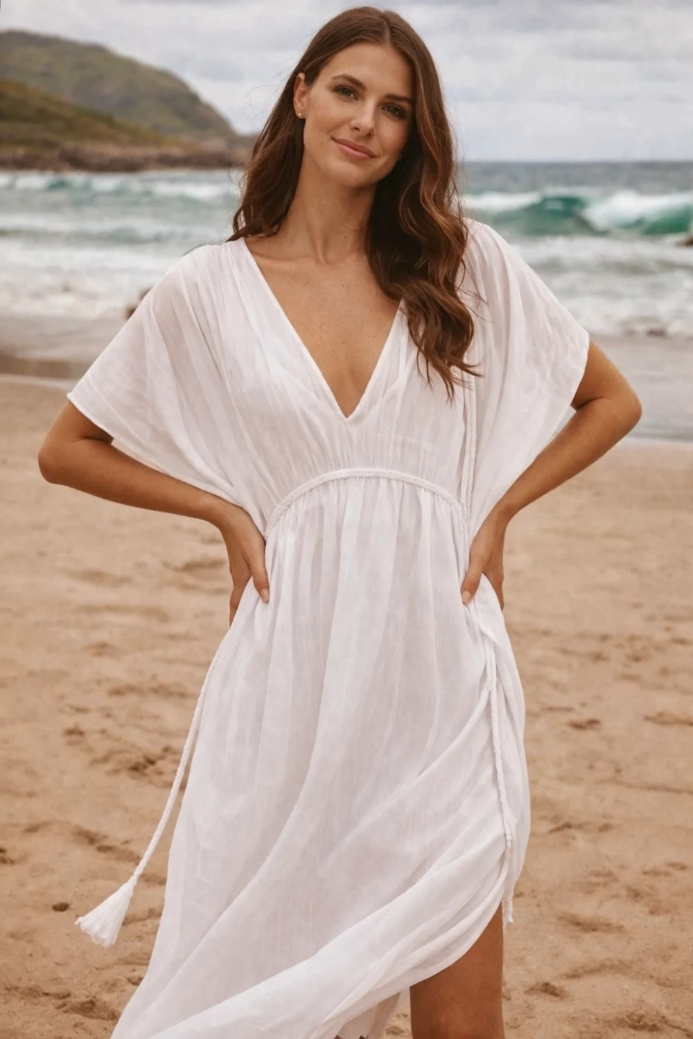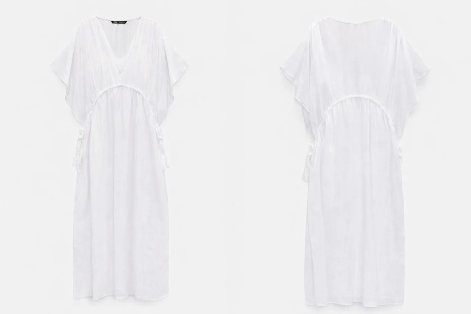 Légies és természetes elegancia a Zara kollekciójából: ez a fehér, 100% pamut hosszú kaftán stílusú darab kényelmes, jól szellőző viselet, tökéletes nyári napokra vagy strand fölé is.