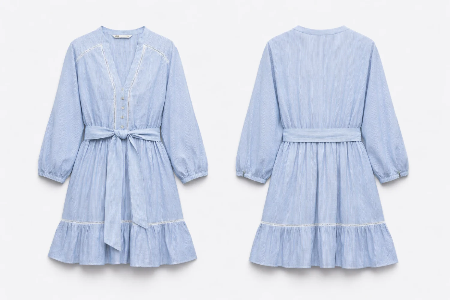 Friss és nőies darab a Zara kollekciójából: ez a fehér/kék csíkos, lenvászon tartalmú nyári ruha csipkebetéteivel és fodros kialakításával könnyed, elegáns megjelenést biztosít a meleg napokra.