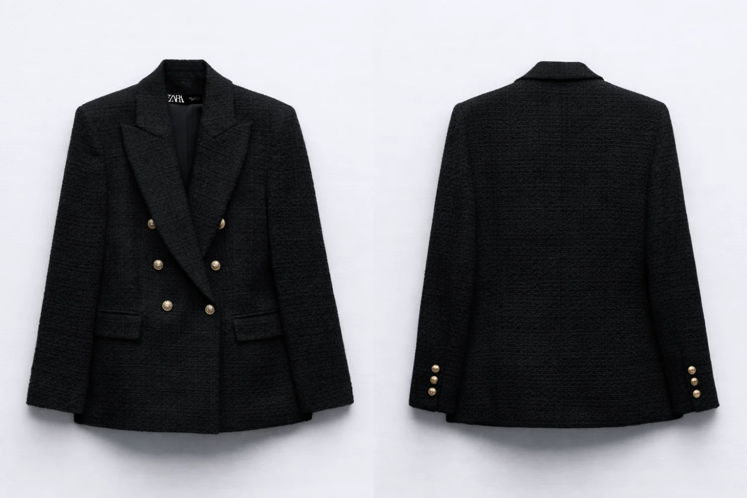 Zara fekete-bézs tweed/texturált blézer – arany díszgombokkal