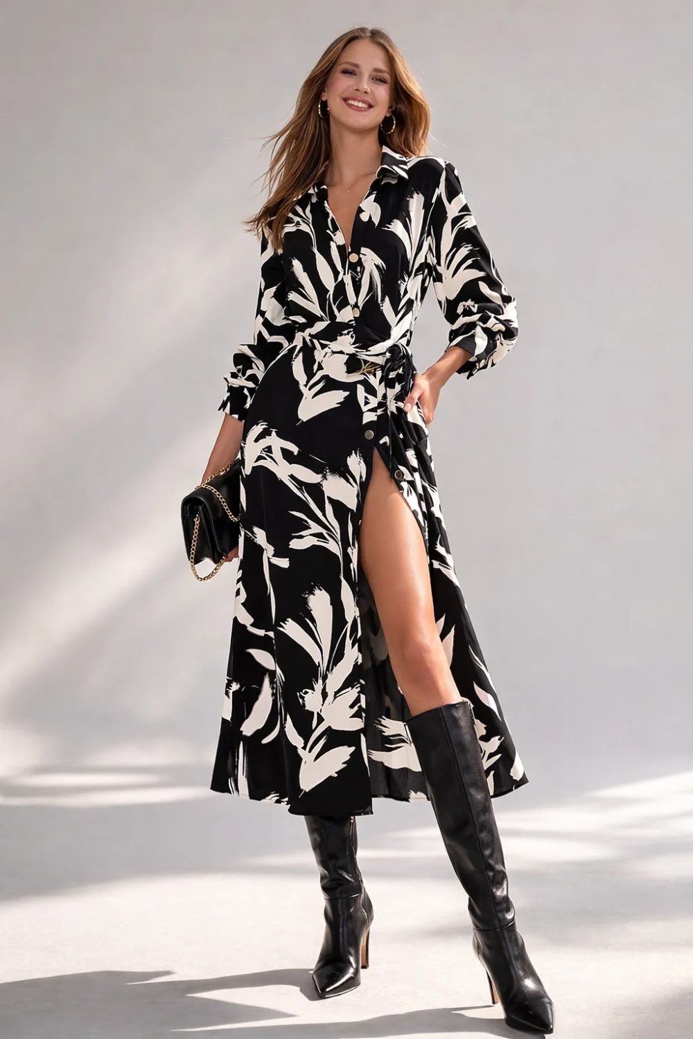 Elegáns és letisztult darab a stílusos megjelenéshez. A szatén anyag finoman fényes, lágy esésű hatást ad, a fekete–fehér mintás design pedig klasszikus és modern egyszerre.