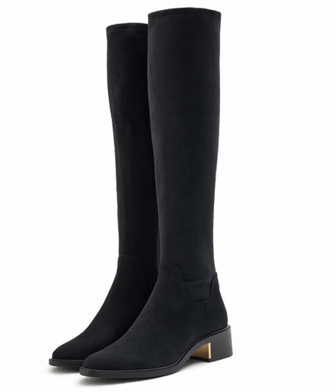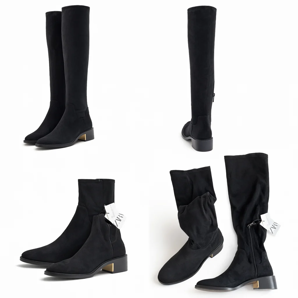 Elegáns Zara térdcsizma fekete velúr hatású anyagból. Hosszú szára és nőies kialakítása stílusos megjelenést biztosít, így tökéletes választás ruhákhoz, szoknyákhoz vagy elegáns hétköznapi szettekhez.