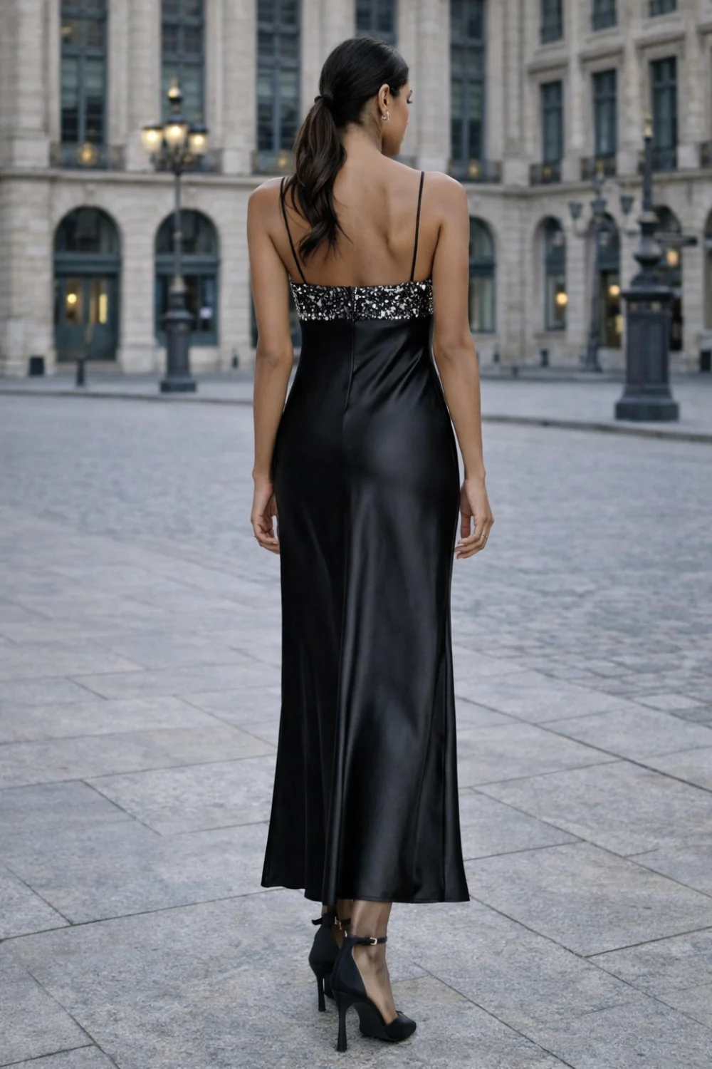 Elegáns, alkalmi darab különleges eseményekre. A szatén anyag lágy esésű, finoman fényes hatást ad, a flitteres mellrész pedig látványos, csillogó részletként emeli ki.