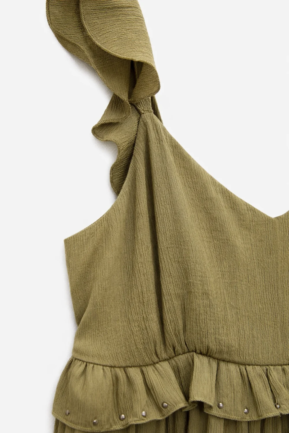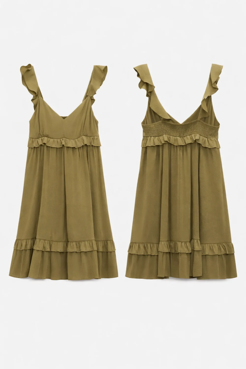 Stílusos és karakteres választás a Zara kollekciójából: ez a khaki színű, fodros ruha különleges szegecses részleteivel egyszerre nőies és vagány megjelenést biztosít. Tökéletes hétköznapokra vagy alkalmi viselethez is.