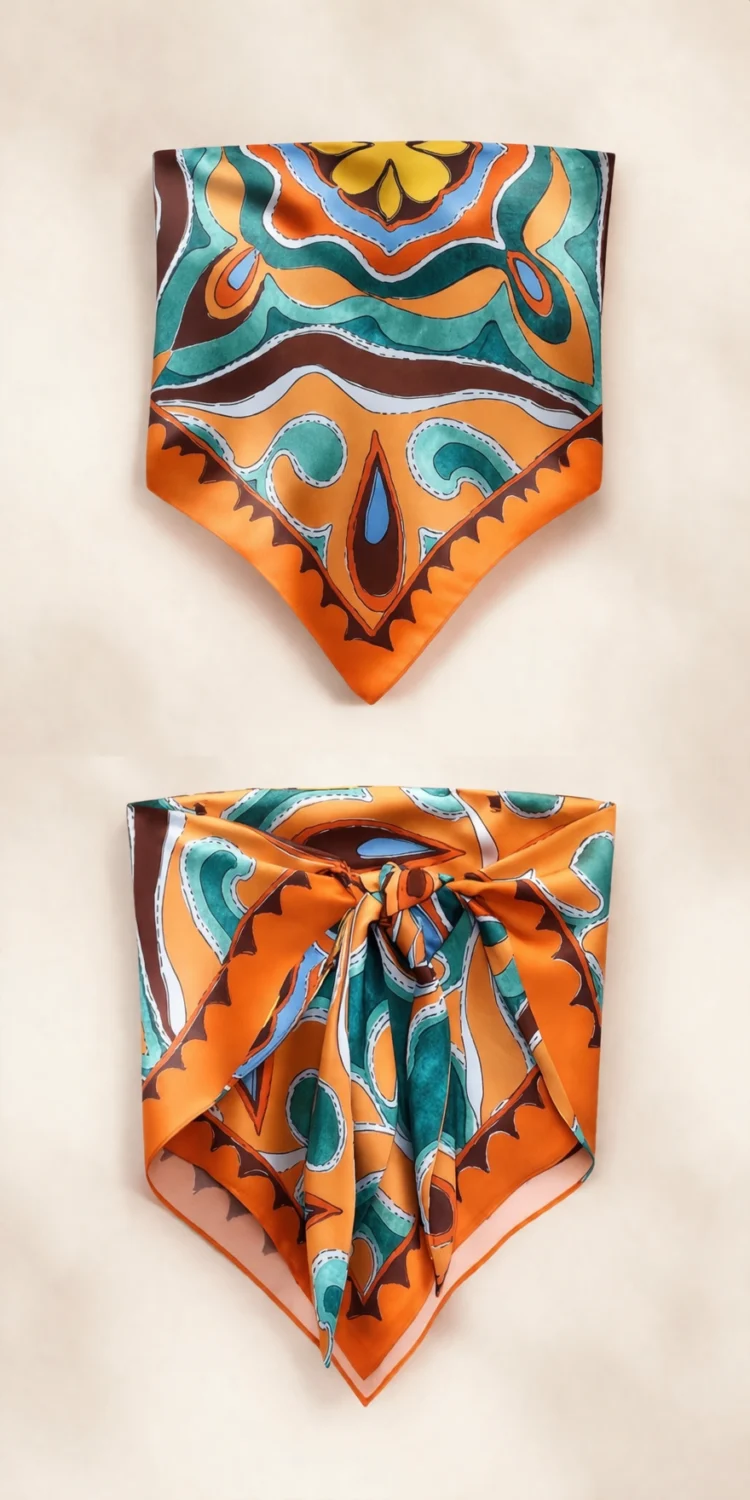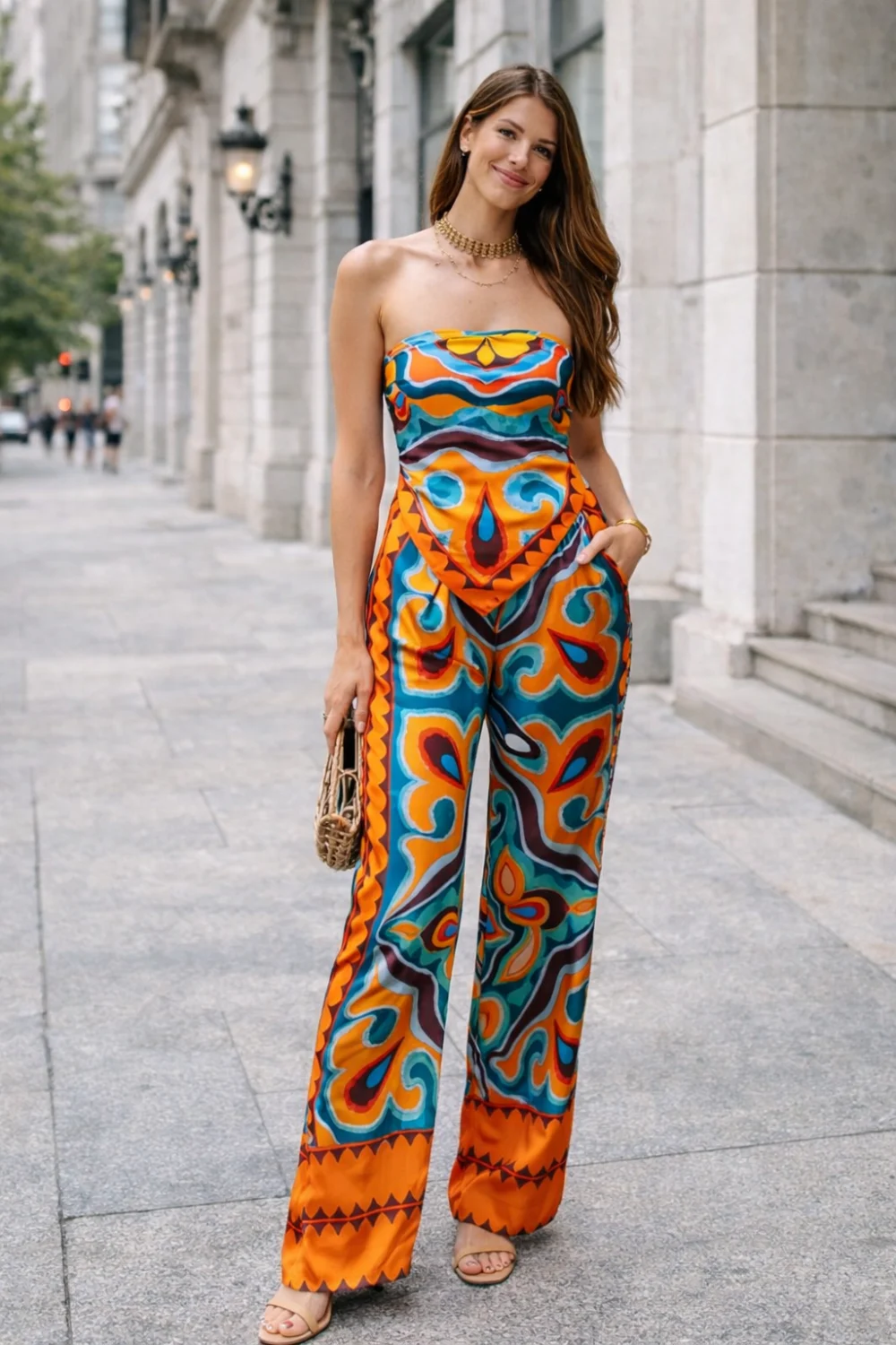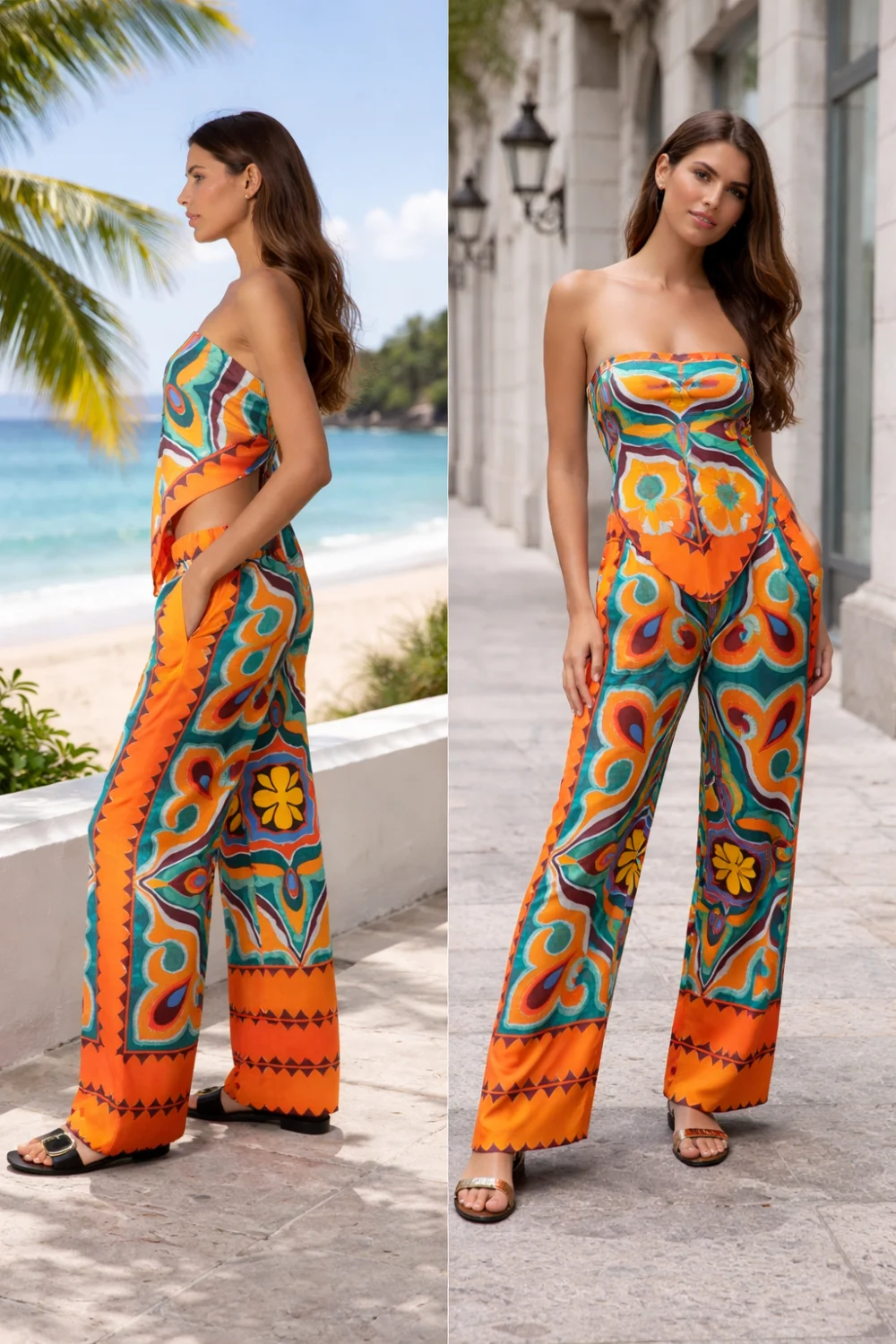 Látványos Zara női szett narancssárga mintás kivitelben, elegáns szatén anyagból. A szett egy könnyű topból és bő szárú palazzo nadrágból áll, amely kényelmes és légies viseletet biztosít. Stílusos választás nyári outfitekhez, alkalmakra vagy különleges megjelenéshez.