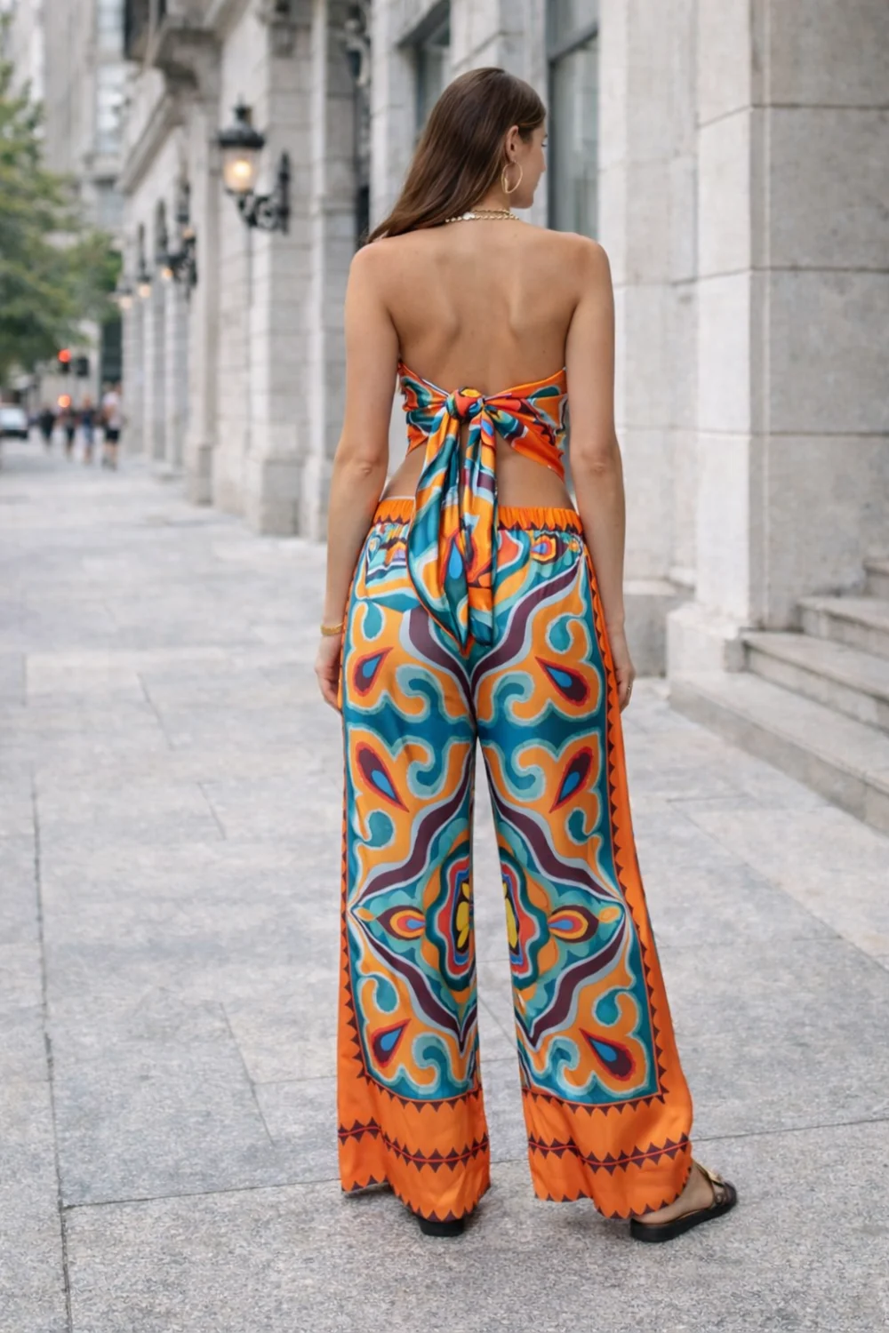 Zara narancssárga mintás szatén szett – top és palazzo nadrág