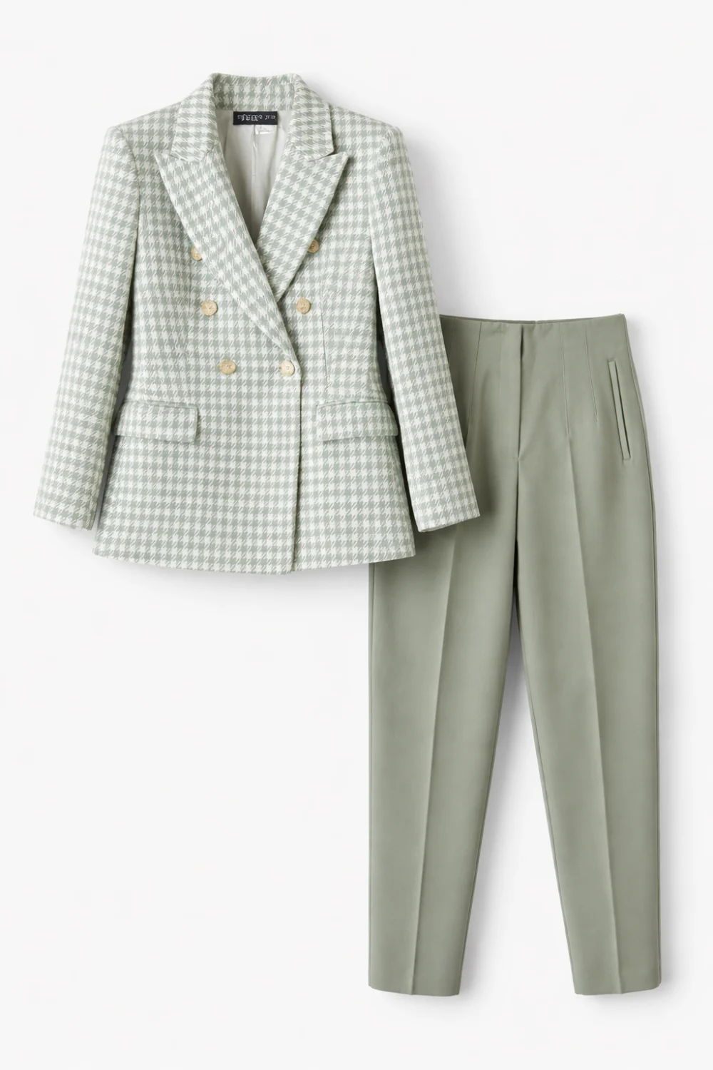 Stílusos és összehangolt szett, amely elegáns megjelenést biztosít. Ez a Zara pasztelzöld magas derekú nadrág és a hozzá illő kockás, texturált blézer modern és nőies összhatást kelt.