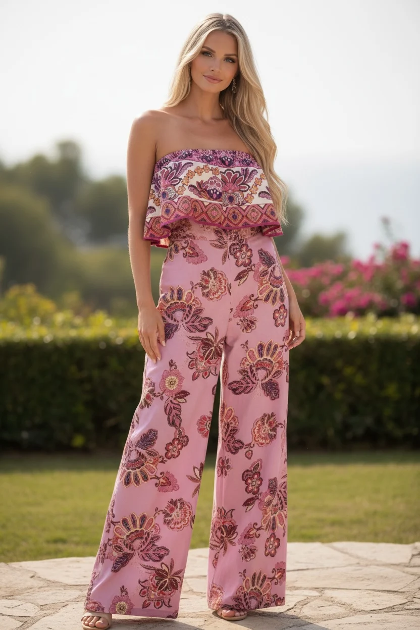 Zara rózsaszín mintás hosszú szatén fodros pánt nélküli overál / hosszú ruha