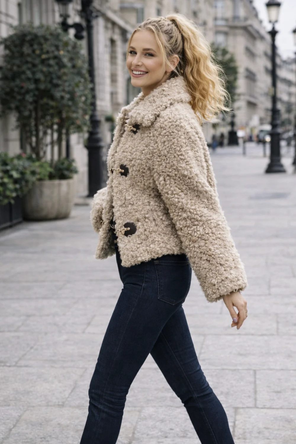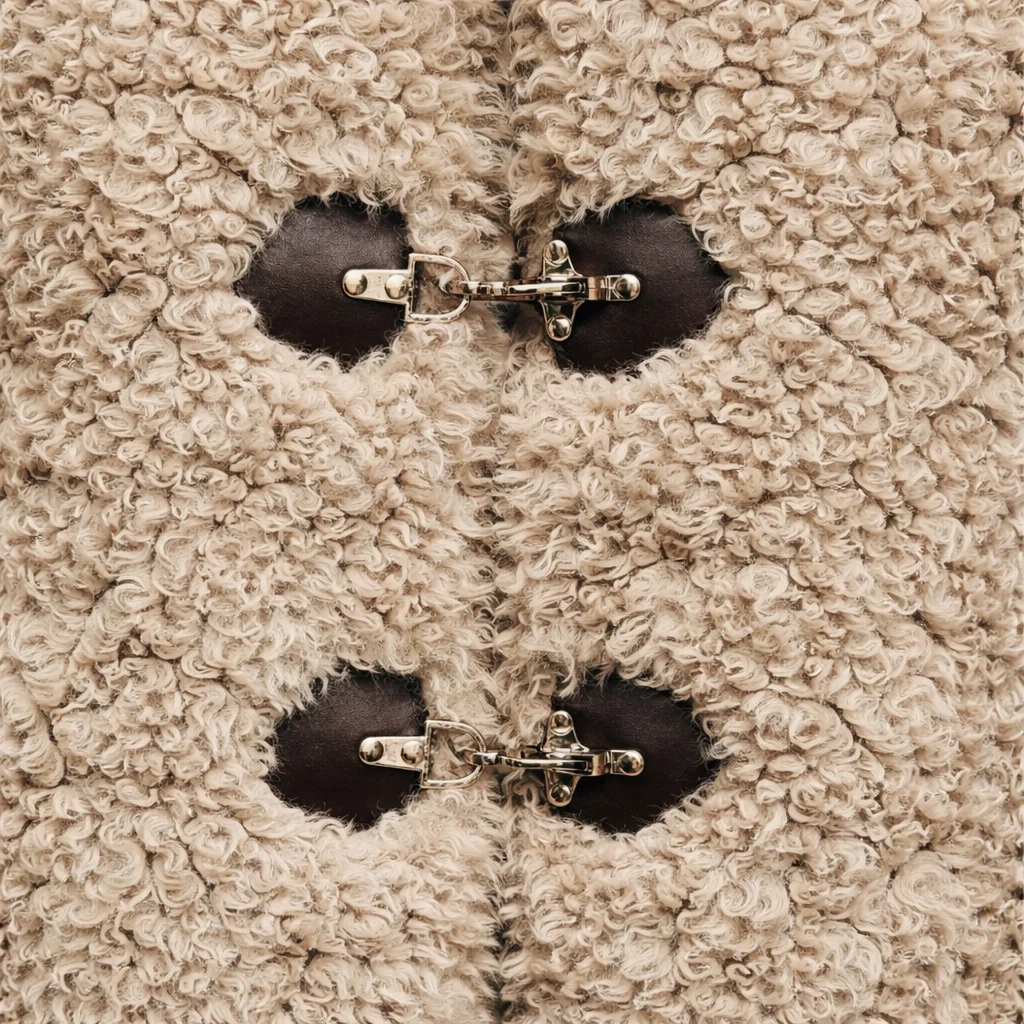 Meleg, stílusos viselet karakteres részletekkel. A puha műszőrme kényelmes, elegáns megjelenést biztosít, míg a billenőkapcsos zárás különleges, modern hangsúlyt ad ennek a csinos darabnak.
